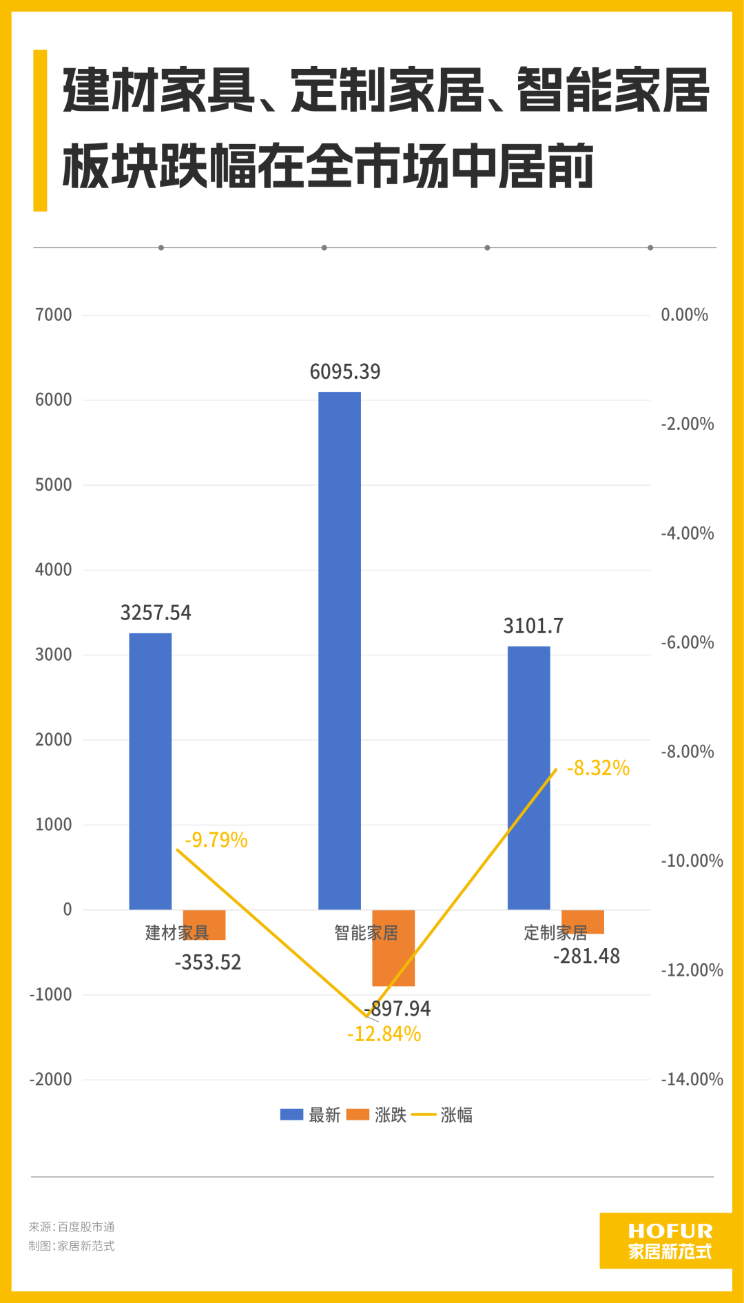 具体到家居行业,家居新范式发现,在各板块中,建材家具、定制家居、智能家居板块4月7日分别下跌9.79%、8.32%、12.84%,跌幅在全市场中居前。
