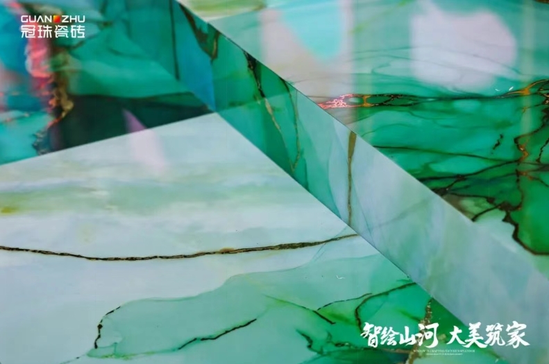 而在瓷砖行业,这股AI风终于刮到了实体产品层面——正在举行的2025佛山潭洲陶瓷展上,冠珠瓷砖展位展出的AI概念岩板新品「山河幻境」吸引了众多观众驻足打卡,这也成为行业首款AI概念岩板。