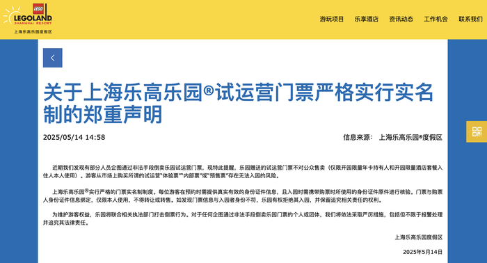5月14日,上海乐高乐园度假区发布声明称,近期发现有部分人员企图通过非法手段倒卖乐园试运营门票,现特此提醒,乐园赠送的试运营门票不对公众售卖(仅限开园限量年卡持有人和开园限量酒店套餐入住人本人使用)。游客从市场上购买所谓的试运营“体验票”“内部票”或“预售票”存在无法入园的风险。