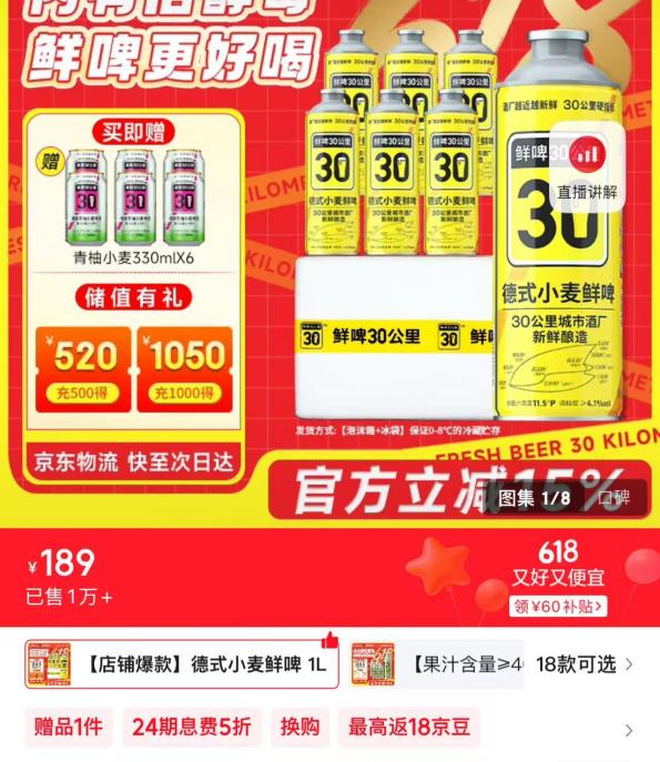 此外,鲜啤30公里的价格并不低,以最热销产品为例6罐1升的啤酒售价为189元,还是在有优惠活动的情况下,折合一罐要31.5元。