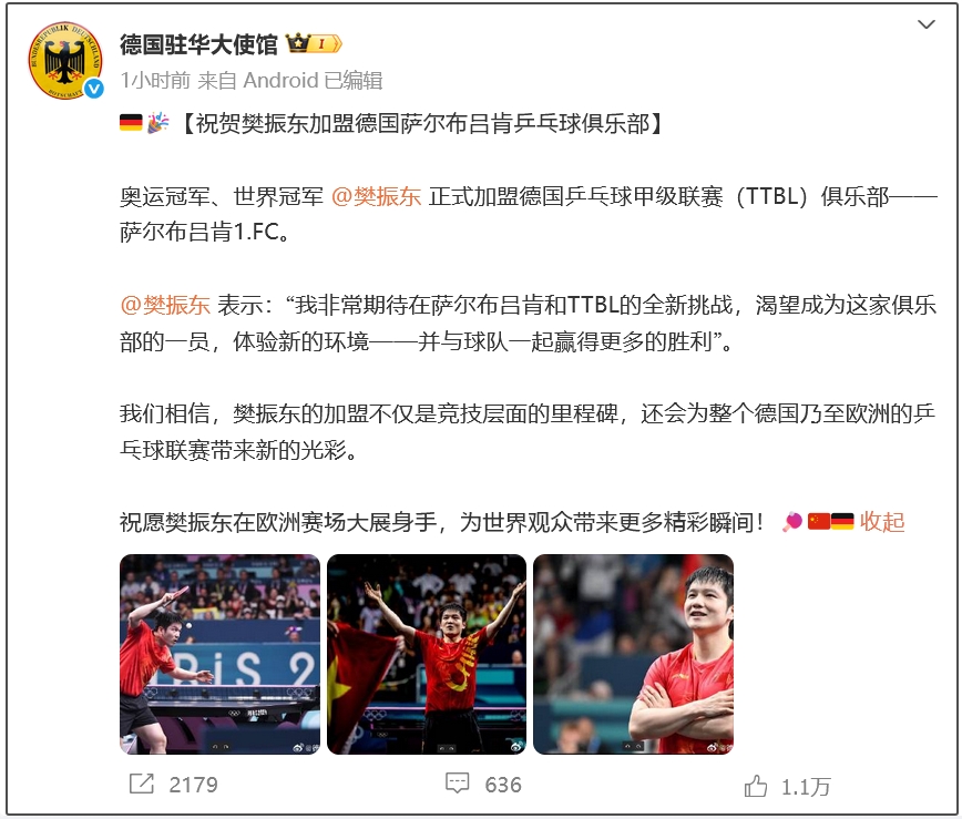 6月3日,@德国驻华大使馆发文,祝贺中国运动员樊振东加盟德国萨尔布吕肯乒乓球俱乐部: