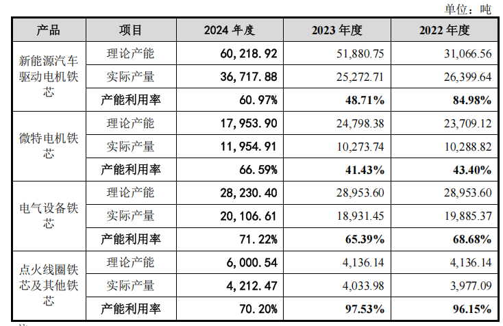 《招股书》披露,在2022年至2024年间,华新精科新能源汽车驱动电机铁芯产能利用率分别为84%、48%、60%,也就是说华新精科除了2022年产能利用率达到了80%以上,其余两年皆低于70%,尤其是2023年,其当年产能利用率仅为48%,下滑了36个百分点。