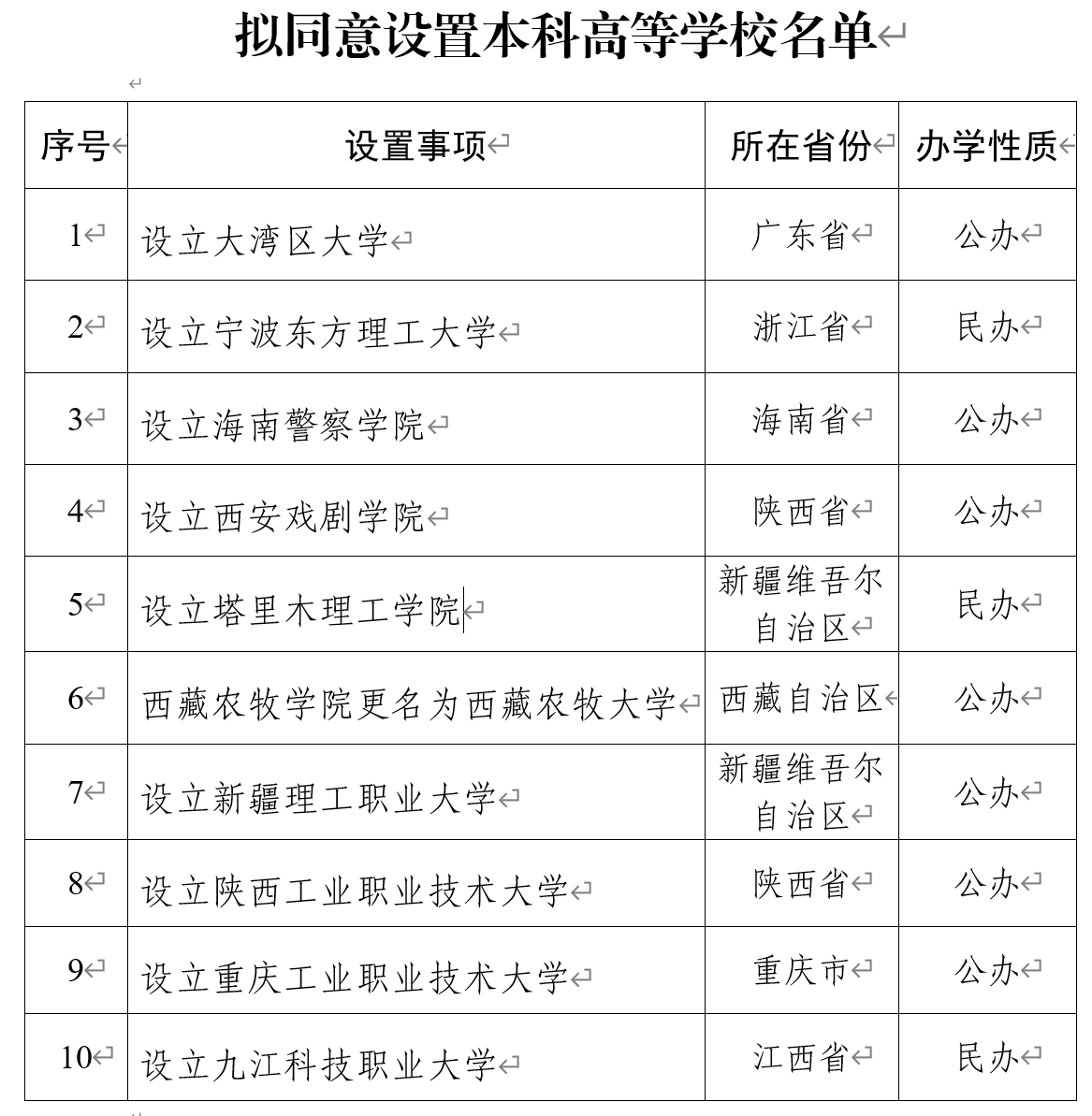 6月11日,教育部网站消息,根据《中华人民共和国高等教育法》《普通高等学校设置暂行条例》《普通本科学校设置暂行规定》《本科层次职业学校设置标准(试行)》等有关规定以及第八届全国高等学校设置评议委员会考察评议结果,经教育部党组会议审议,拟同意设置大湾区大学等10所学校,现予公示。