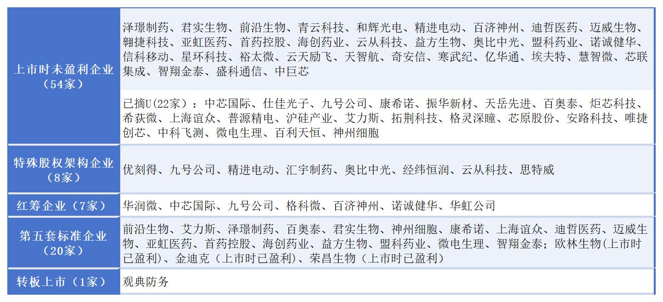 此外,还有8家特殊股权架构企业、7家红筹企业、20家第五套标准上市企业,1家转板上市企业。科创板目前累计22家公司实现“摘U”,其中微电生理、百利天恒、神州细胞2024年首次实现扣非前后净利润为正值,已于年报披露后“摘U”。