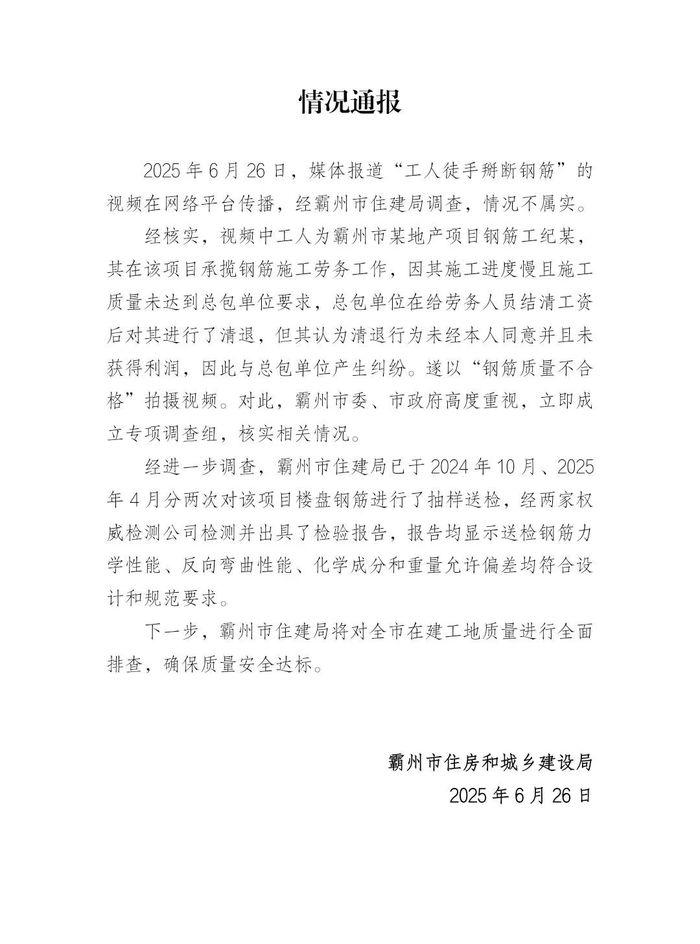 霸州市住房和城乡建设局通报,6月26日,媒体报道“工人徒手掰断钢筋”的视频在网络平台传播,经霸州市住建局调查,情况不属实。