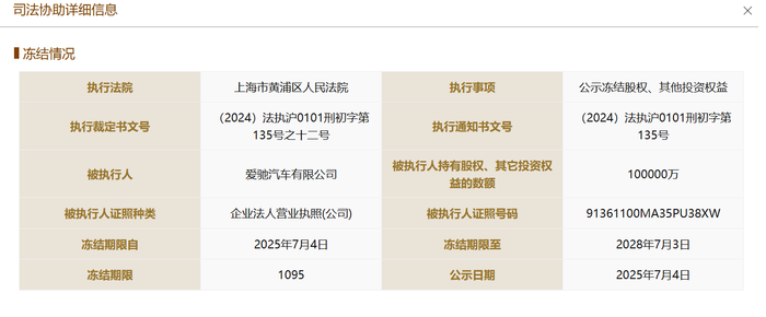 国家企业信用信息公示系统网站显示,7月4日,爱驰汽车有限公司新增一则股权冻结信息,股权所在企业为上海亿维新能汽车研发有限公司,冻结股权数额10亿人民币,冻结期限3年,执行法院为上海市黄浦区人民法院。