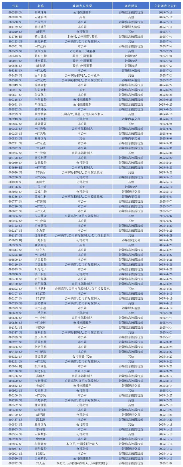 今年以来被立案调查的上市公司或个人