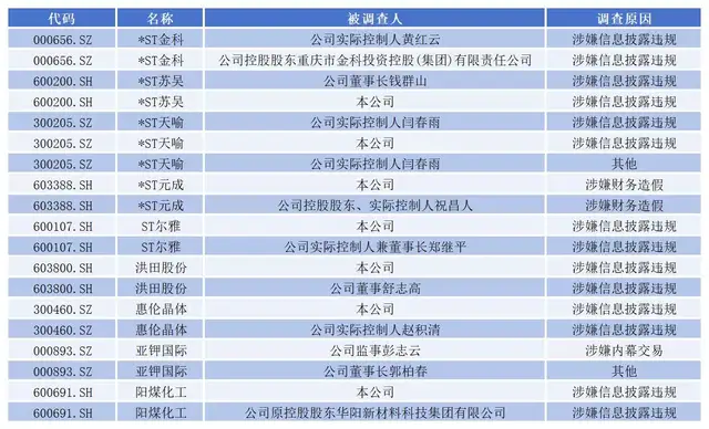 *ST金科、亚钾国际2家公司虽然公司本身没有被立案调查,但前者实控人和控股股东均被立案调查,后者董事长和监事均被立案调查。