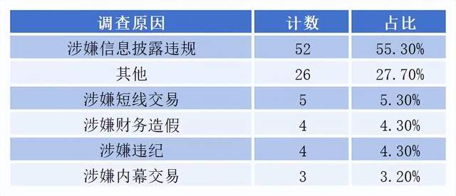 从调查原因,在上述94起立案调查事项中,涉嫌信息披露违规的有52项,占比55.3%;涉嫌短线交易的有5项,占比5.3%;涉嫌财务造假和违纪的各有4项,占比4.3%;涉嫌内幕交易的有3项,占比3.2%。