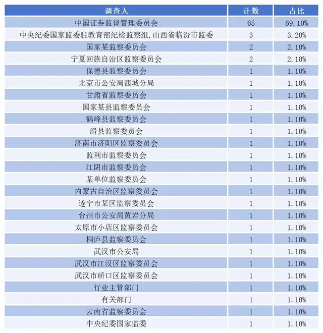 从调查人类型看,在上述94起立案调查事项中,除了中国证券监督管理委员会之外,各地区的监察委员会占据相当大的比重。此外,各地公安局、行业主管部门也偶有出现。