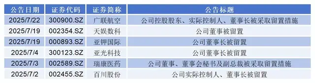 今年以来,资本市场上刮起了一股“留置风”。仅7月以来,就有广联航空、天娱数科、亚钾国际、亚光科技、瑞康医药、百川股份6家上市公司披露了公司高管被留置的相关公告。