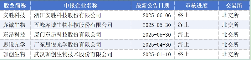 较为引人注目的是,包括安胜科技、赤诚生物、东昂科技、思锐光学、珈创生物在内的5家企业的IPO申请材料在2024年才刚刚被受理,但在今年就已经全部显示为终止状态,且均为北交所上市企业。
