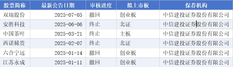 在撤回+终止IPO申请的企业中,还出现同一券商旗下项目接连撤回的现象。根据同花顺数据,民生证券、中信证券、中信建投的撤回项目最多,均为6个。