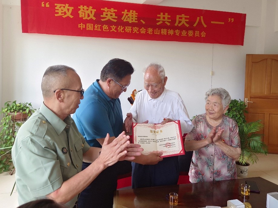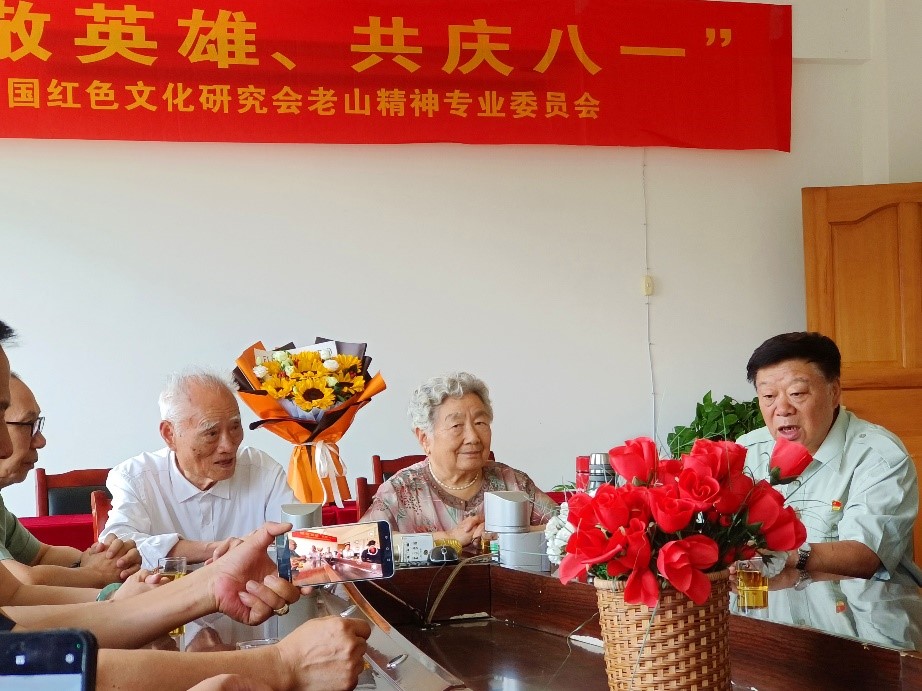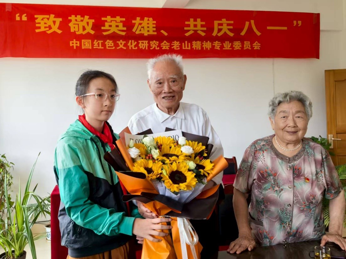 在热烈的掌声中,杨成林主任和张光军秘书长共同为赵中州老英雄颁发了荣誉证书,并由红军小学少先队员代表向赵老敬献鲜花,将座谈会气氛推向高潮。与会人员纷纷发言,表达对赵中州老英雄在战争年代建立的功勋以及和平时期为国家、人民所作贡献的崇高敬意,共同庆祝中国人民解放军建军98周年。