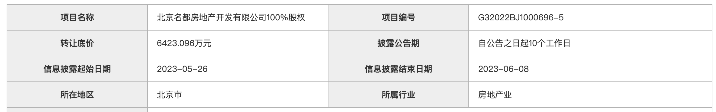 5月26日,据北京产权交易所披露的信息,大悦城控股旗下子公司香港鹏源发展(越秀)有限公司转让北京名都房地产开发有限公司100%股权,转让底价已由最初的1.32亿元降至6423.096万元,信息披露结束日期为2023年6月8日。