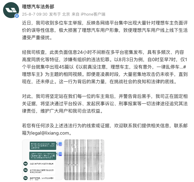 8月7日上午,理想汽车法务部发布声明称,近日公司收到多位车主举报,反映各网络平台集中出现大量针对理想车主负面评价的误导性信息,极大损害了理想汽车用户形象,致使理想汽车用户线上线下生活遭受严重侵扰。经公司核查,此类负面信息24小时不间断在多平台密集发布,具有多频次、内容高度同质化等特征,涉嫌有组织的违法犯罪。以8月3日为例,自0时至早7时,仅1个平台就集中出现45篇以《以前真没注意,理想车主,没有意外,一律乱停车…#理想车主》为主题的相同视频。对此,公司正在固定相关证据,将坚决通过平台投诉、发起民事诉讼、刑事报案等一切法律途径追究其法律责任。