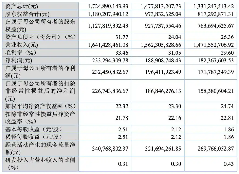 从财务数据看,2020年—2024年,公司营收分别为9.94亿元、14.21亿元、14.72亿元、15.62亿元和16.41亿元,归母净利润分别为1.3亿元、1.58亿元、1.72亿元、1.96亿元和2.32亿元。