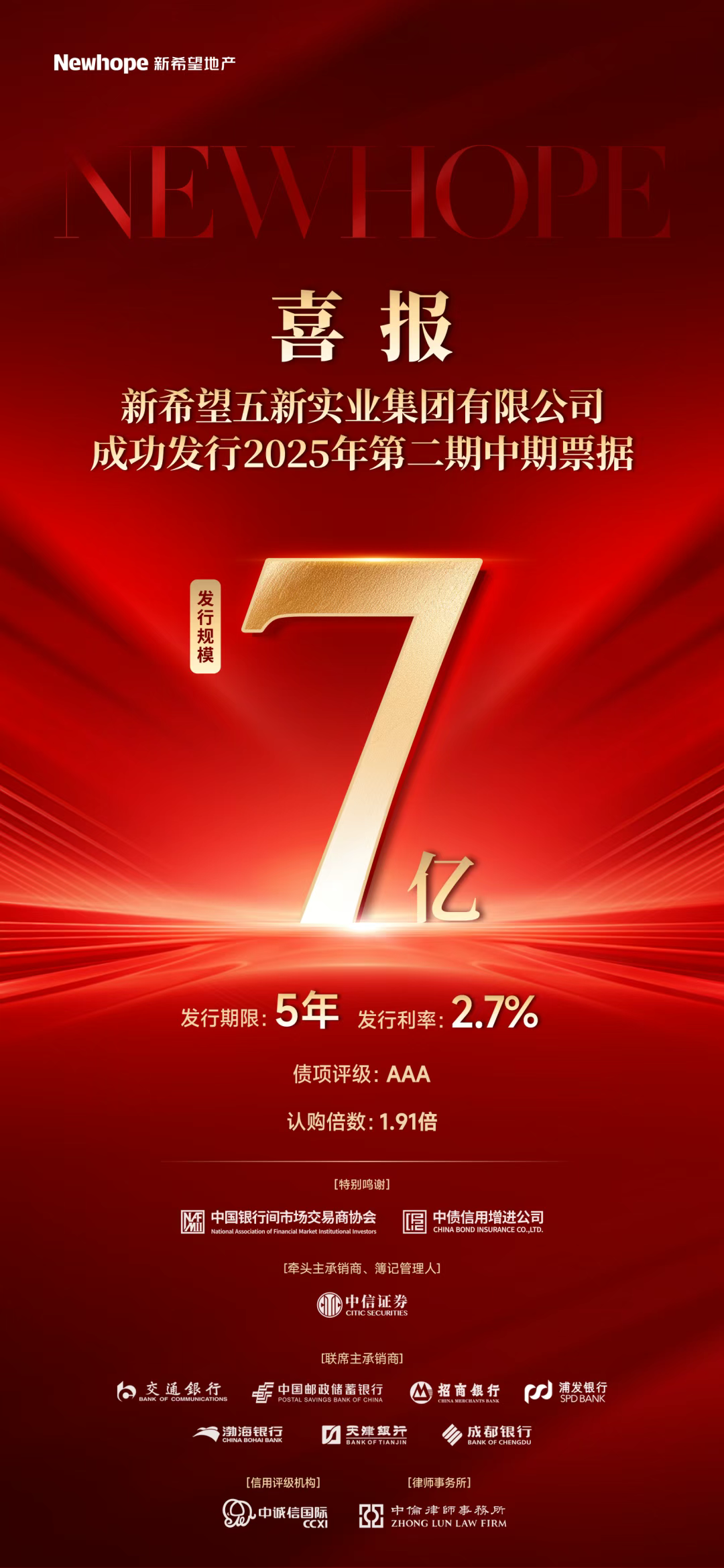 近日,新希望五新实业集团有限公司(以下简称“新希望地产”)成功发行为期五年的2025年第二期中期票据。此次发行总额为7亿元,票面利率2.70%,并由中债信用增进投资股份有限公司提供全额保证担保。全场认购倍数1.91倍,投资者参与踊跃。