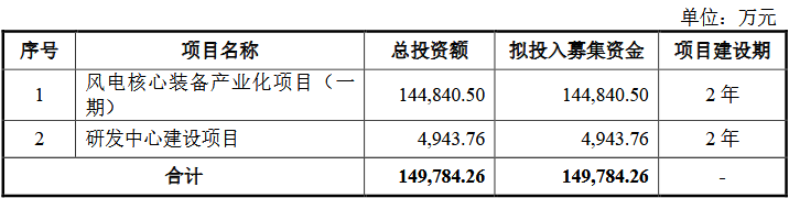 根据最初的募资计划,20.48亿元拟募资金中14.48亿元用于风电核心装备产业化项目(一期),5.5亿元用于补充流动资金(约占募资总额的27%),仅4943.76万元用于研发中心建设项目(约占募资总额的2%)。