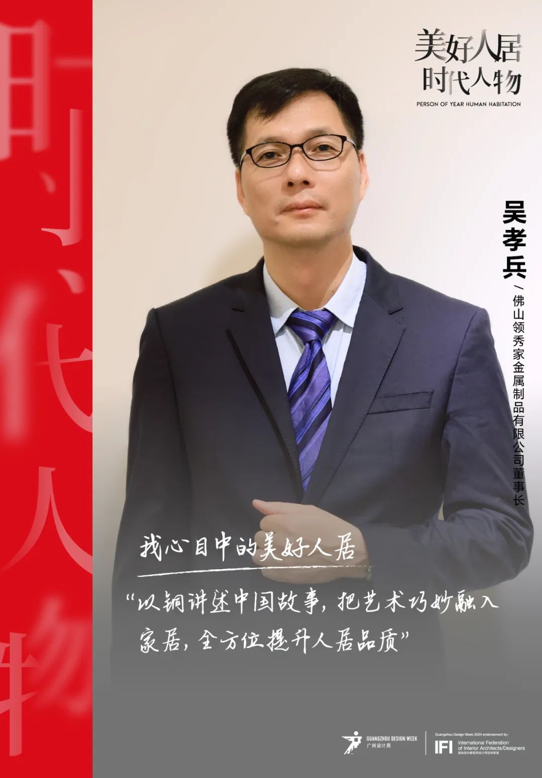 在“当代人居生活美学策源地”的发展愿景下,广州设计周携手家居新范式打造《美好人居时代人物》、《美好人居青年领袖》内容栏目,记录90+泛家居产业领军人物与先锋人物为满足人们对于美好人居生活的向往,而在材料技艺、空间业态、生活方式等方面所做出的策源创举和卓越贡献,深度探讨行业发展的新趋势、新未来、新模式。本期专访对话本期专访对话佛山领秀家金属制品有限公司董事长吴孝兵,洞察铜木缘的品牌理念,看铜家居生活的倡导者如何创新新中式家具。
