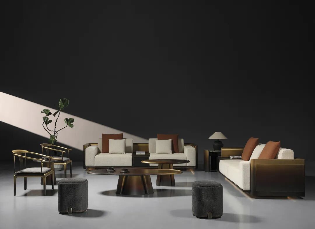 比如新推出的逸境沙发,就是以铜为主要结构设计的产品,冷硬的铜和温软的沙发形成对比。布艺是采用进口材料,沙发坐垫用高密度的回弹海绵填充,包裹性强,久坐不塌。与之配套的,是天青色的星河屏风和铜艺茶几。家具组合营造出古典又不失现代的客厅环境。