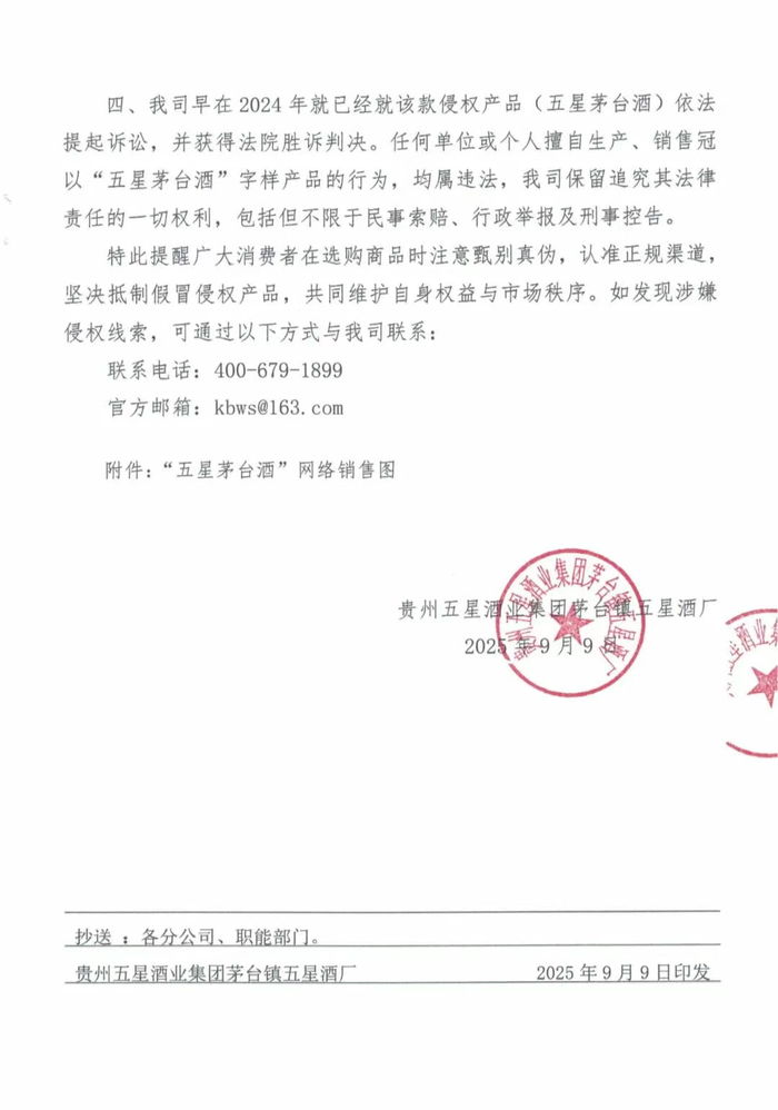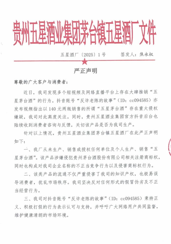 五星酒业称,公司早在2024年就已经就该款侵权产品(五星茅台酒)依法提起诉讼,并获得法院胜诉判决。任何单位或个人擅自生产、销售冠以“五星茅台酒”字样产品的行为,均属违法,公司保留追究其法律责任的一切权利,包括但不限于民事索赔、行政举报及刑事控告。