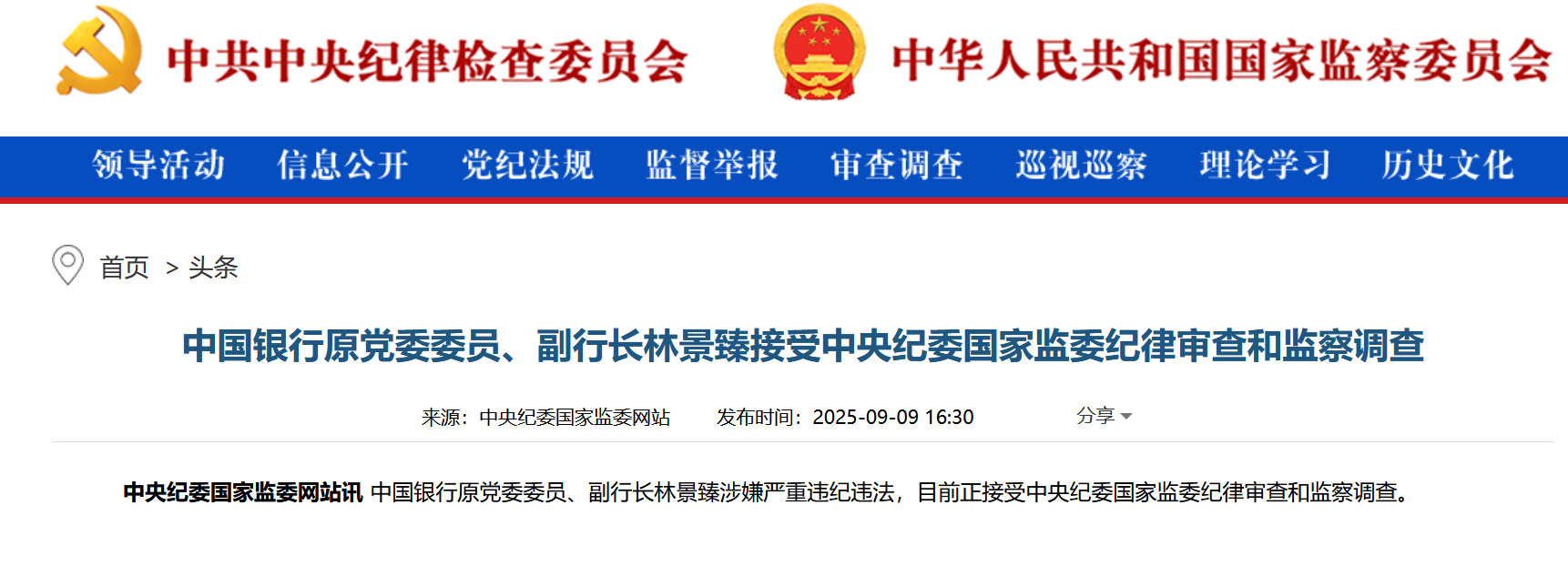 中央纪委国家监委网站9月9日消息,中国银行原党委委员、副行长林景臻涉嫌严重违纪违法,目前正接受中央纪委国家监委纪律审查和监察调查。