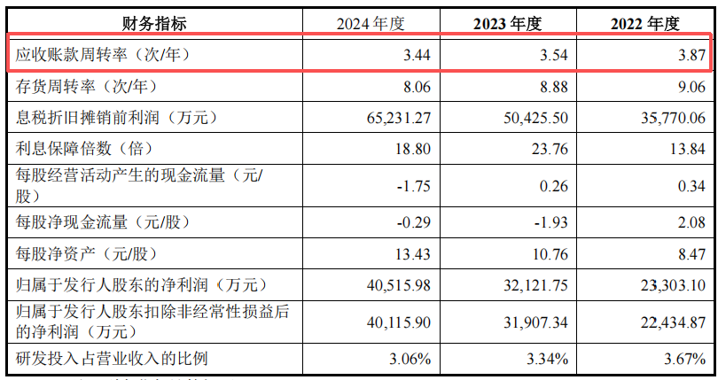 此外,在回款周期模式下,报告期内,公司应收账款余额从66245.45万元激增至128339.09万元,占营收比例从26.76%升至31.03%,坏账准备余额从3580.39万元增长至6970.15万元,应收账款周转率也从3.87降至3.44。
