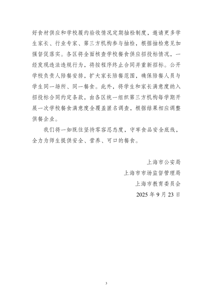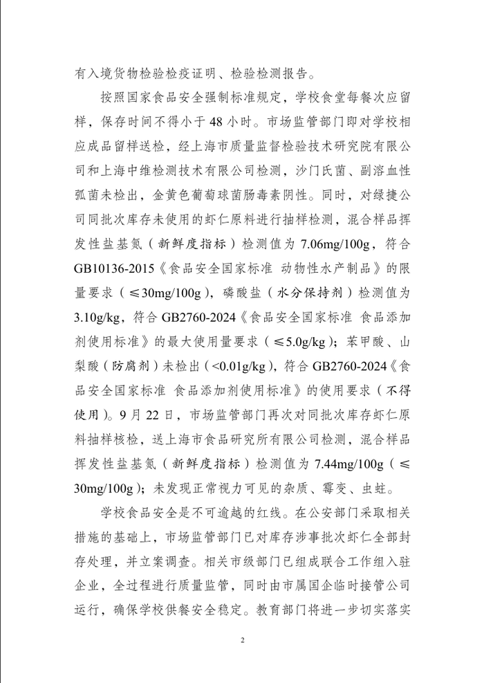 上海市公安局、上海市市场监督管理局、上海市教育委员会9月23日通报,现已查明:9月15日9时40分左右,绿捷公司派驻静安区某小学经理孙某某发现配送至该校的3箱虾仁解冻焯水后,其中一盆(约18公斤)内有虫,即报告公司品质部负责人钱某,钱某将情况报告公司实际控制人张某某,张某某指令业务经理等人对供应211所学校(含分校区)的虾仁原料及菜品全部下架并就地销毁。9月16日,张某某要求总经理董某某对外统一称:下架原因系虾肠外溢,有泥沙。绿捷公司涉嫌瞒报食品安全相关信息,目前公安机关已立案侦查,并控制相关人员。
