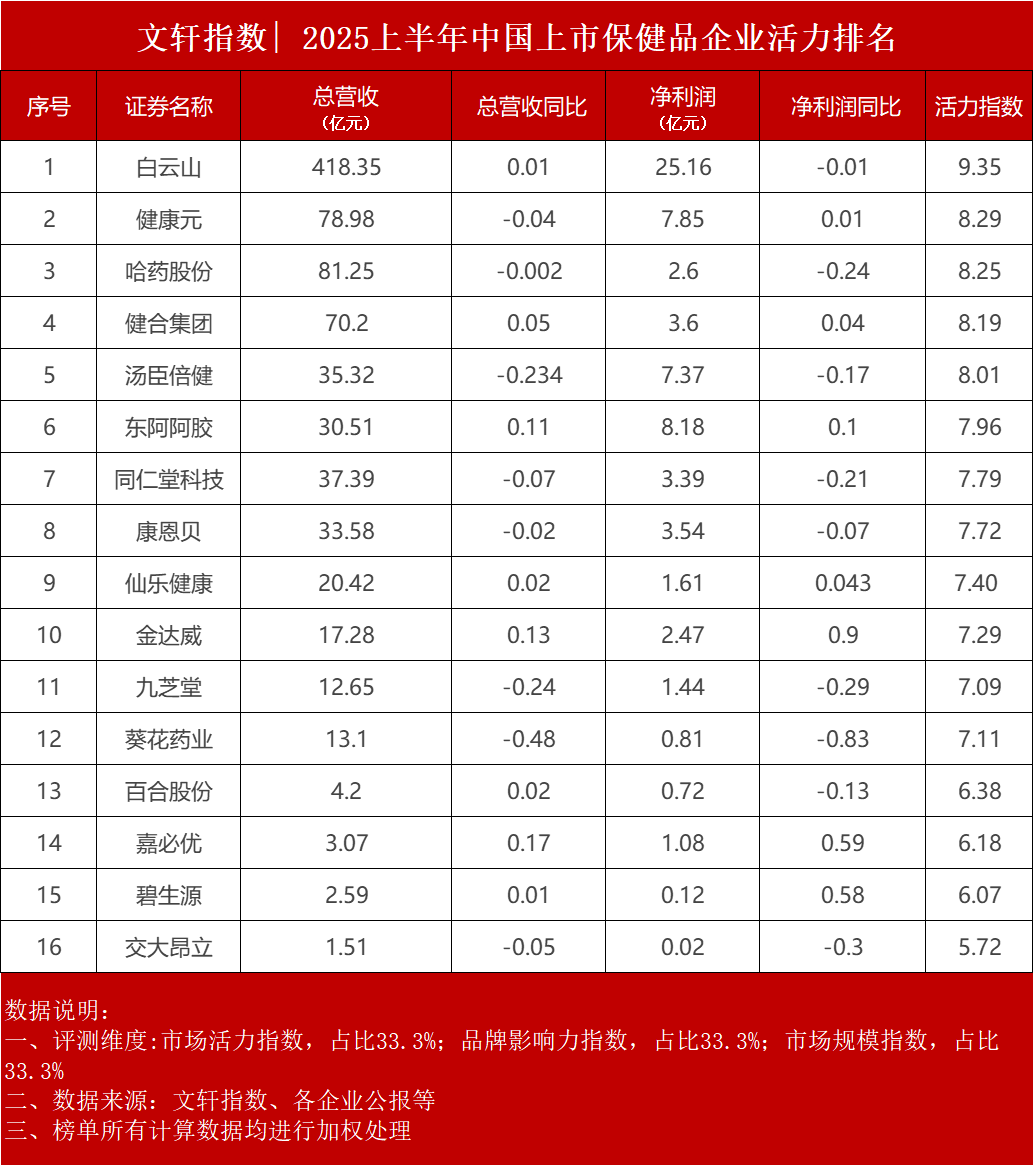 对此,文轩指数推出2025上半年保健食品企业活力排名,活力是企业发展的必备条件,是创新和适应市场变化的内在能力,我们从多项数据维度评判,试图探究保健食品行业的一些发展趋势。