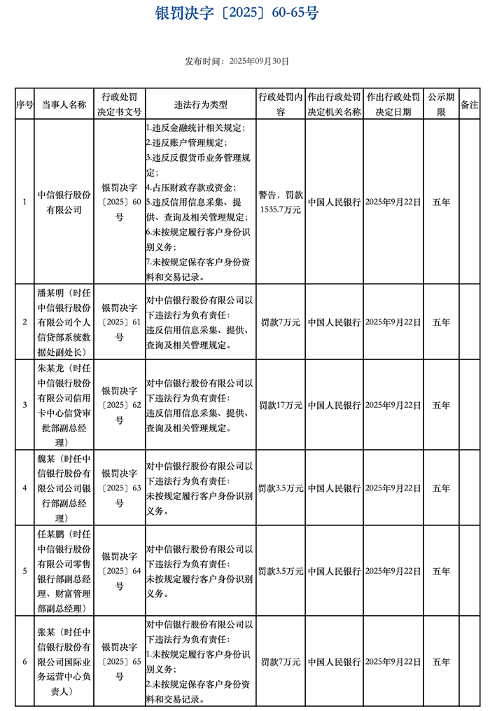 9月30日,央行行政处罚公示信息显示,中信银行股份有限公司因涉及7项违法行为被警告,并被罚款1535.7万元。