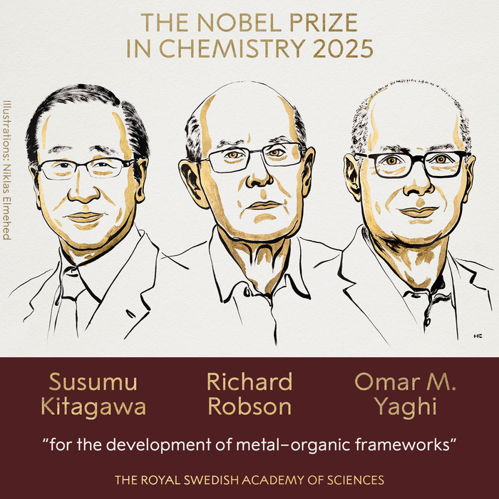瑞典皇家科学院当地时间10月8日宣布,将2025年诺贝尔化学奖授予北川进 (Susumu Kitagawa)、理查德·罗布森(Richard Robson)和奥马尔·M·亚吉 (Omar M. Yaghi),以表彰其在金属有机骨架开发领域的贡献。