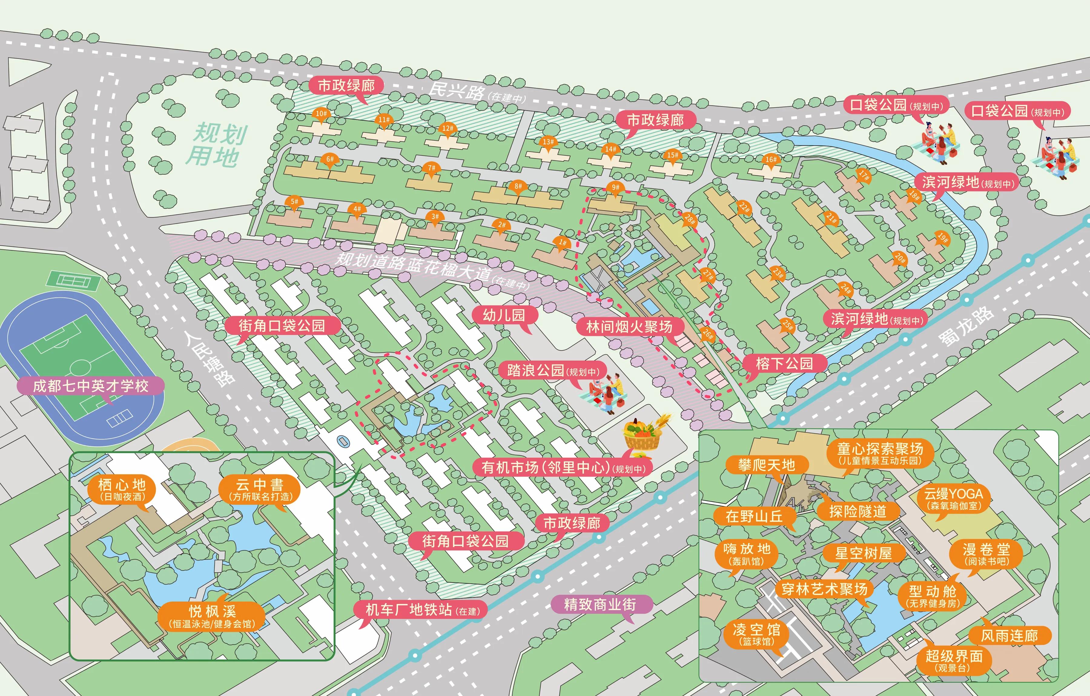 超20+主题聚场,激活全龄生活:“让建筑退到自然后面,让生活走到舞台中央”,项目规划两环·三轴·三庭·四园景观体系,加上商街、独立会所和架空层空间,以友邻·共创·活力·亲子·栖心五大维度,打造超20+主题空间场,把“社区”升级为“剧场”,人人都是生活的主角。