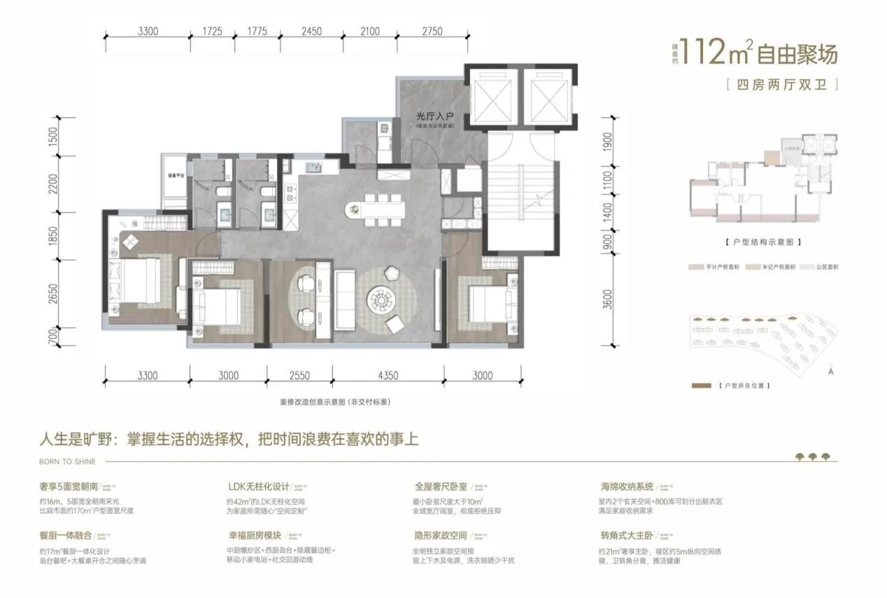 建面约112㎡实现高效四房,具备约16米五面宽朝南的奢尺采光,以及约42㎡无柱化LDK厅的灵动空间。它颠覆了传统小户型的局限,通过全屋奢尺卧室、餐厨一体融合及海绵收纳系统,在有限面积内承载无限生活可能。以主城300万起的总价级,用更友好的置业门槛,把空间、采光、收纳都做到越级配置,让改善门槛不再高不可攀。
