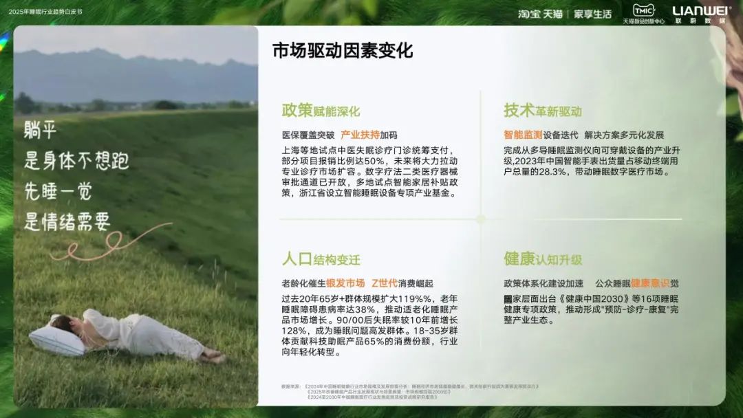 根据报告,中国睡眠经济的迅速崛起,是由政策、技术、人口、健康认知等多方面因素交织而成的。