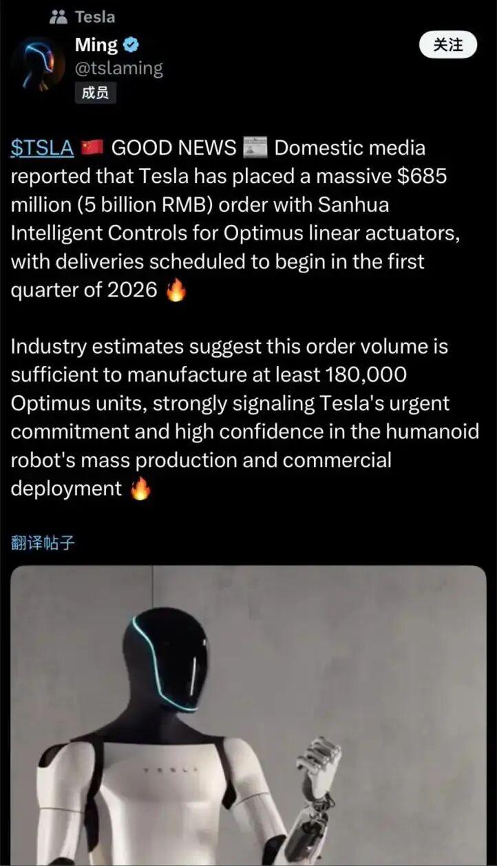 10月15日上午,ID为@tslaming的个人账号发帖称,“国内媒体报道称,特斯拉已向三花智控下达价值6.85亿美元(约合50亿元人民币)的大额订单,采购Optimus线性执行器,首批交付计划于2026年第一季度启动。”