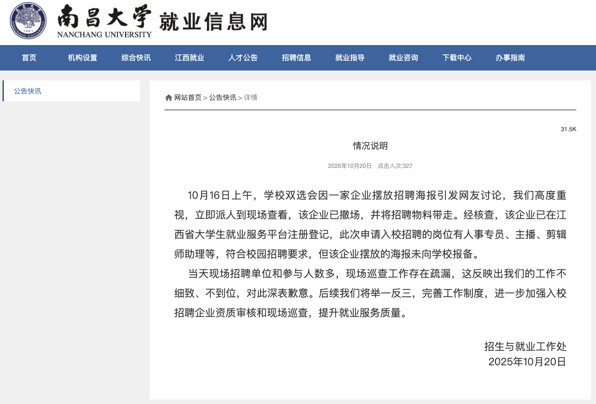 近日,多位网友发帖称,南昌大学招聘会上有企业招聘女主播,其海报被指内容露骨,引发网络热议。10月20日,南昌大学招生与就业工作处发布情况说明: