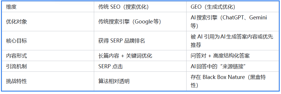 GEO并非一个全新的概念,但其核心目标与传统 搜索引擎优化(SEO)存在根本差异。传统SEO的核心在于争夺搜索结果页面(SERP)的品牌排名,而 GEO优化 的目标是让品牌信息能够被AI搜索助手(Chatbot)引用为答案来源或直接推荐链接。