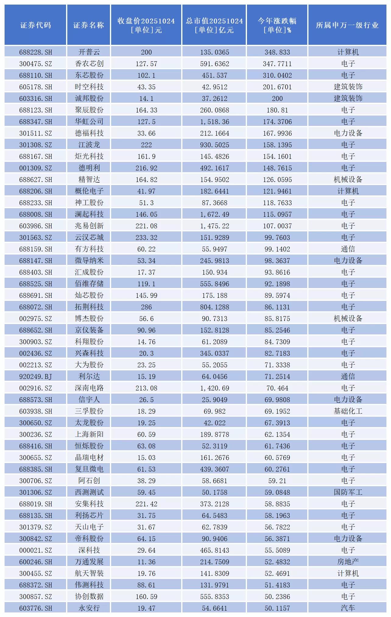 其中,涨幅超过50%的有49家公司。开普云、香农芯创、东芯股份、时空科技、诚邦股份、聚辰股份、华虹公司、德福科技、江波龙、炬光科技、德明利、精智达、概伦电子、神工股份、澜起科技、兆易创新16家公司股价成功实现翻倍。