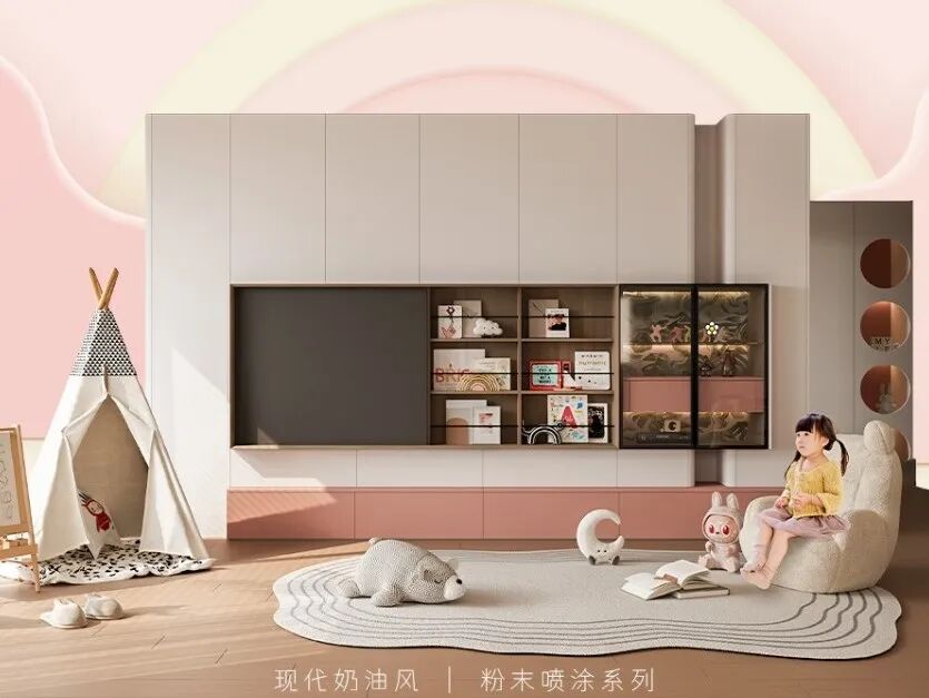 设计特点:柜体应用圆弧、异形门型、斜拼接抽屉,细节满满,充满童趣;收纳架移门柜,打破传统电视柜的功能局限;没有分割“儿童区”与“成人区”,只有被设计精心呵护的共生时光。