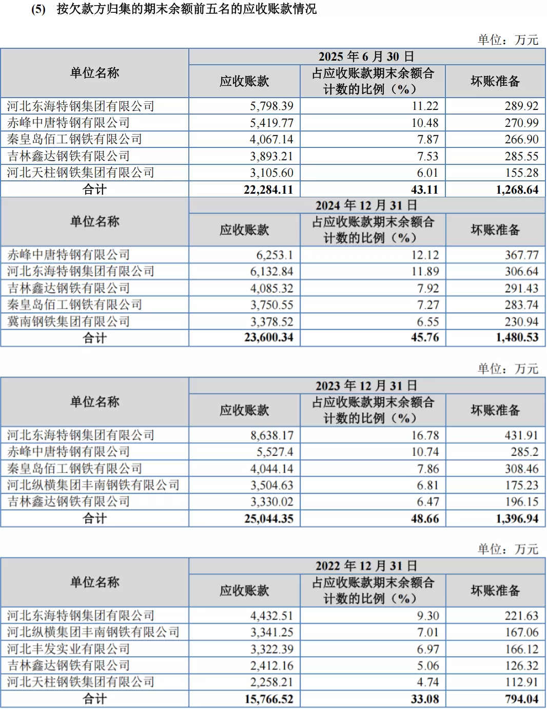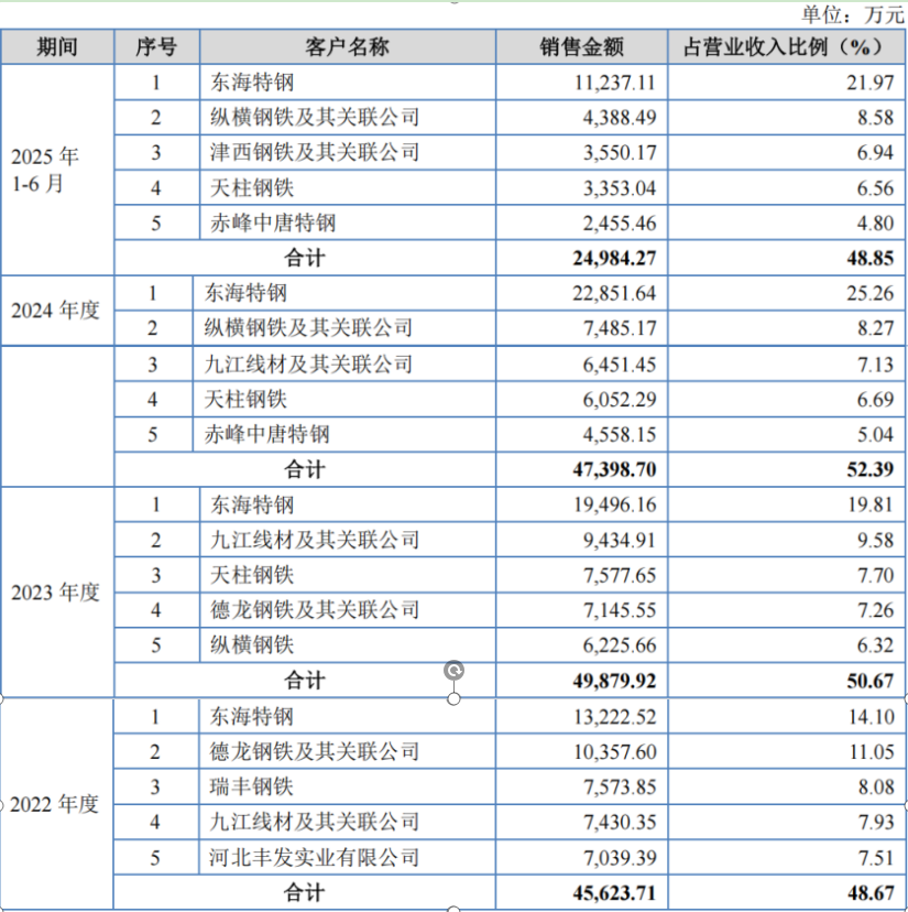 2022年至2025年6月,公司前五名客户销售收入及占当期营业收入比例情况如下: