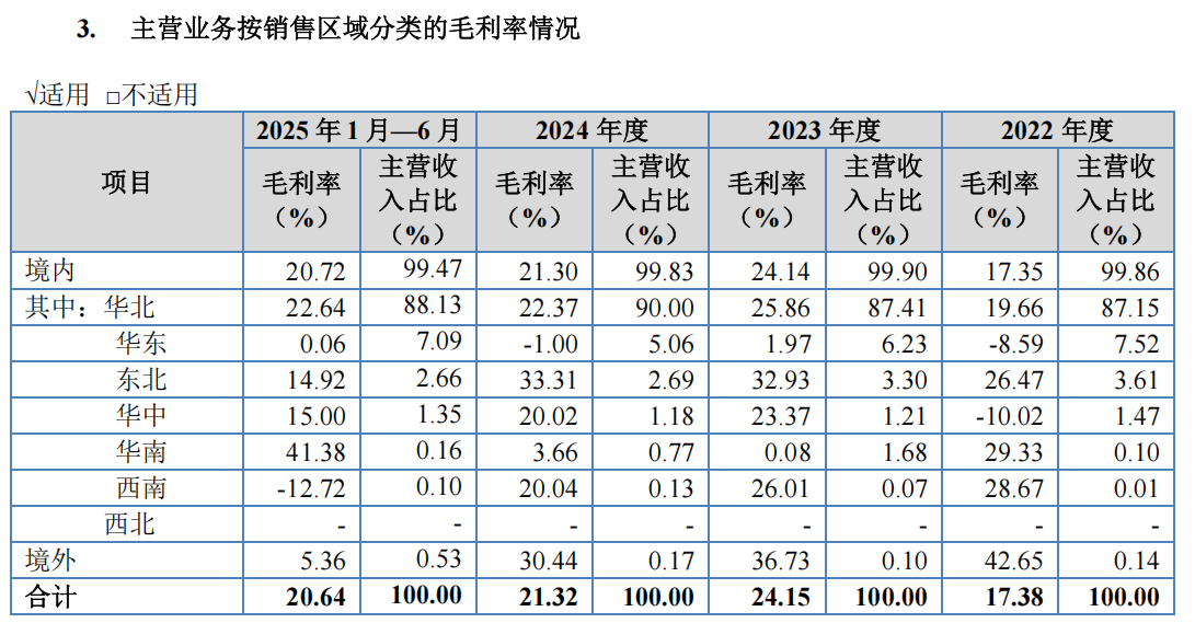 其中,2022年至2025年6月,公司主营业务收入中来自河北省内的比例分别为 77.35%、76.83%、79.96%和 81.35%,占公司主营业务收入的比例较高。