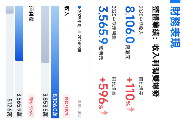 公告显示,捷利交易宝2025年中期实现收入8,106万港元,同比增长110%;净利润3,566万港元,同比飙升596%,展现出强劲的增长动能与财务质量。