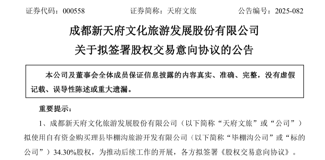 为保障交易顺利推进,天府文旅拟与大九旅、重庆冠忠、西部旅游、毕棚沟公司签署《股权交易意向协议》。