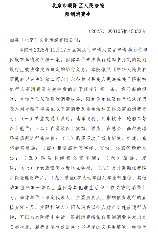 中国执行信息公开网显示,12月4日,伯喜(北京)文化传媒有限公司及其法定代表人刘光耀新增一则限制消费令,涉及股东知情权纠纷案件,申请人为刘光耀前妻安吉,执行法院为北京市朝阳区人民法院。