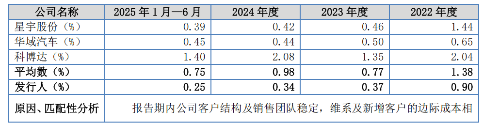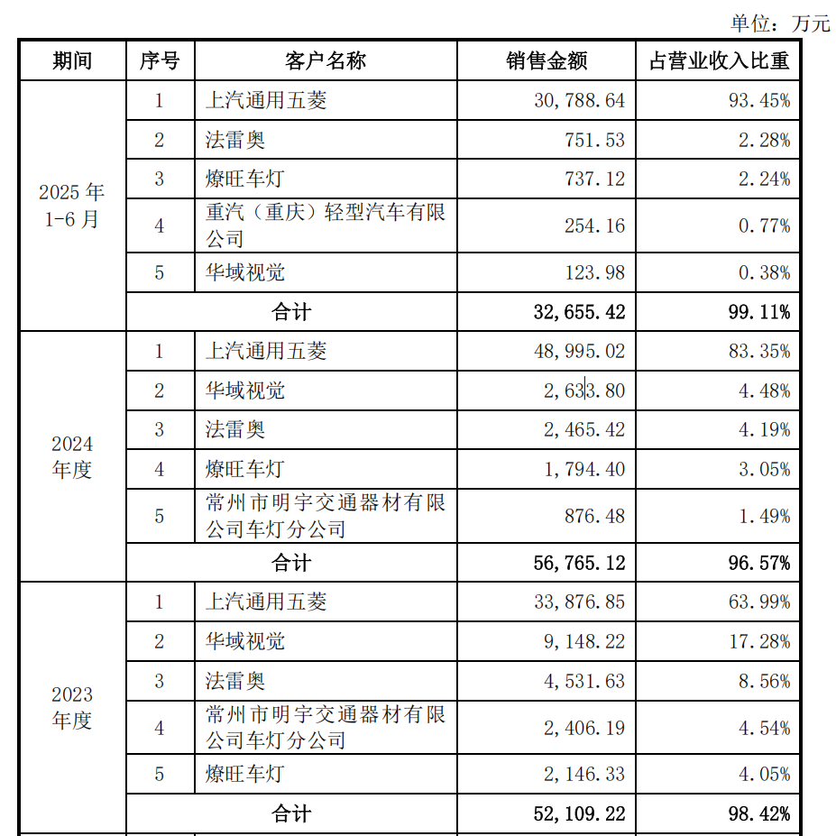 《招股书》显示,2022年-2024年,通宝光电向前五大客户销售占比均超过95%,向第一大客户上汽通用五菱销售占比分别为67%、64%以及83%。如果只看2025年上半年的数据,通宝光电对上汽通用五菱销售占比则更高,今年上半年对单一大客户上汽通用五菱销售占比达到了93%。