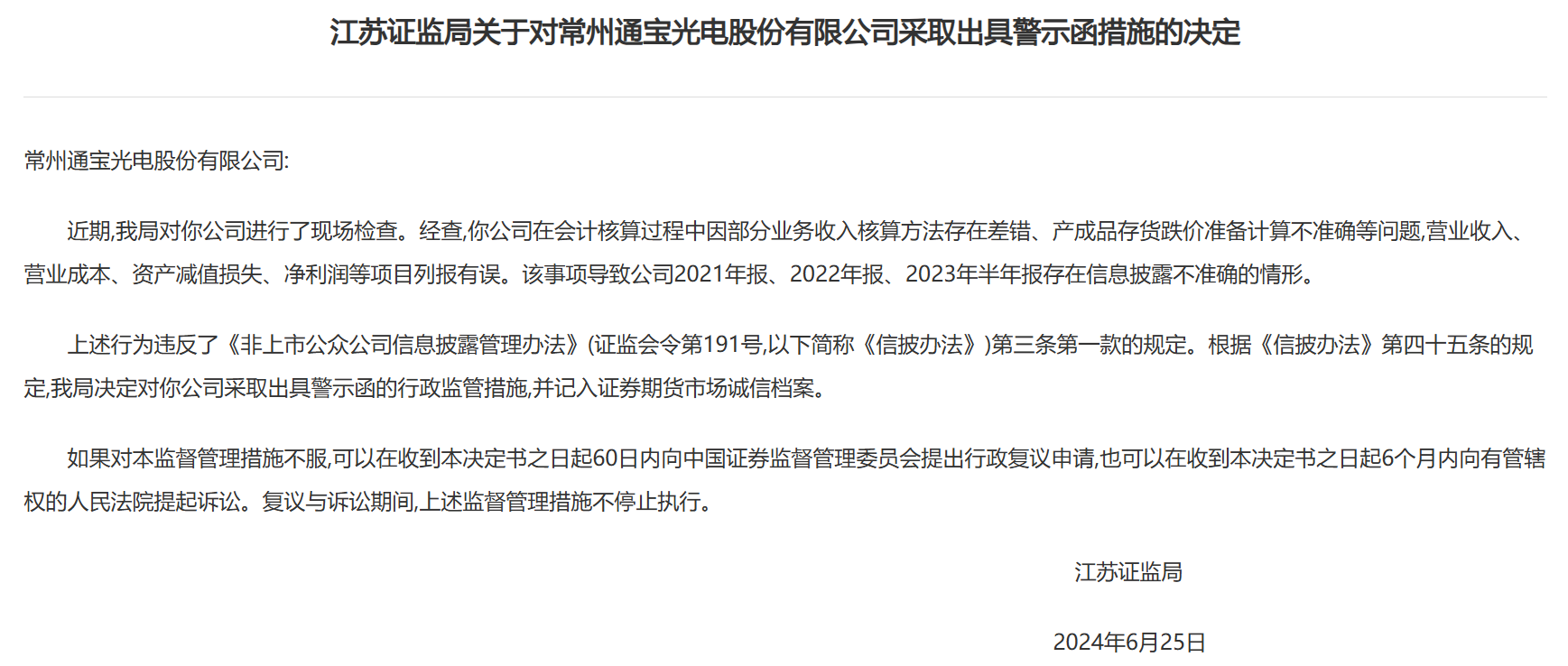 证监会对通宝光电进行现场检查之后,向其“采取出具警示函措施”。其中提到通宝光电“部分业务收入核算方法存在差错、产成品存货跌价准备计算不准确等问题,营业收入、营业成本、资产减值损失、净利润等项目列报有误。该事项导致公司2021年报、2022年报、2023年半年报存在信息披露不准确的情形”。