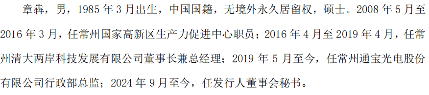 图 13 通宝光电董秘章犇履历(来源:招股书)