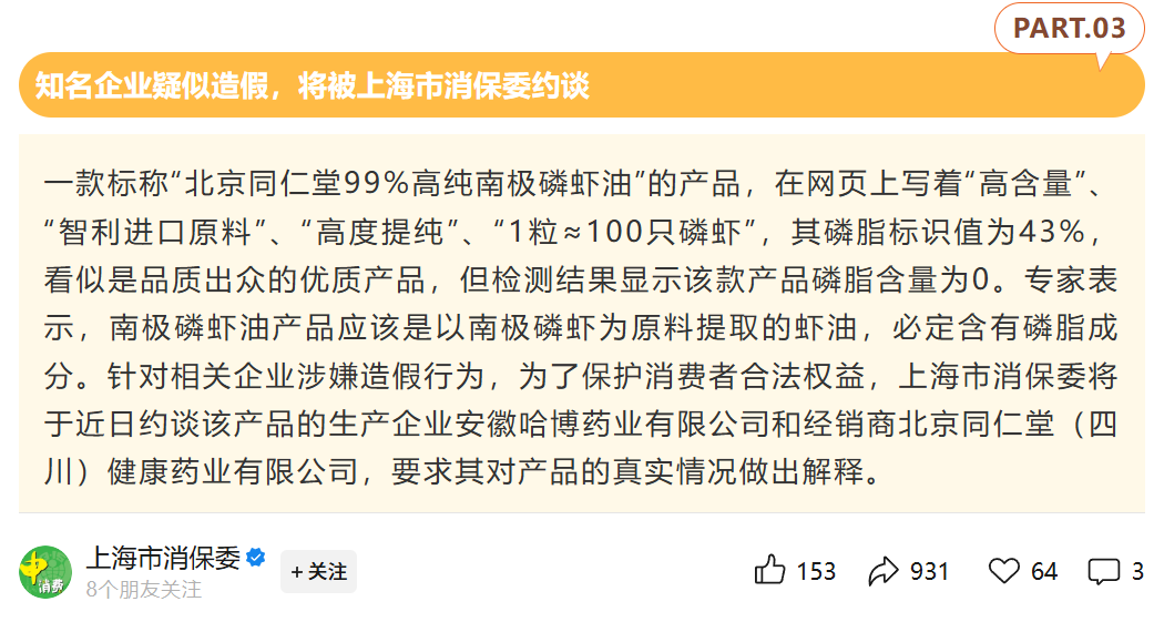 近日,上海市消保委微信公众号发布了一篇名为《南极磷虾油真的有用吗?我们发现这3款还不错,知名企业疑似造假,将被上海市消保委约谈|消保委亲测》文章,文章称对15款不同品牌的南极磷虾油产品比较检测结果。其中,一款名为“北京同仁堂99%高纯南极磷虾油”的产品,其磷脂标识值为43%,但实测却为0。