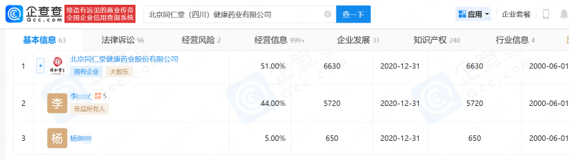 企查查显示,北京同仁堂(四川)健康药业有限公司,成立于2000年6月29日,注册资本13000万元 ,第一大股东为北京同仁堂健康药业股份有限公司,持股51.00%。